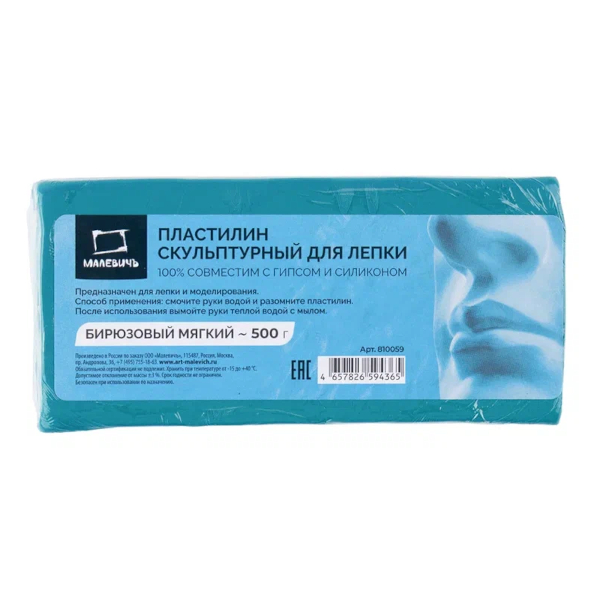 Пластилин скульптурный Малевичъ бирюзовый, 500г, мягкий, полиэт.уп. 810059
