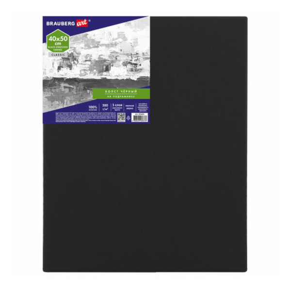 Холст грунтованный на подрамнике (40*50см) 380г/м2, мелкое зерно, хлопок, черный 191651 Brauberg