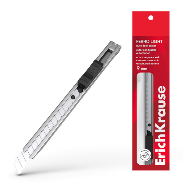 Нож канцелярский 9мм "Ferro Light" метал.корп., автофиксатор, серебро, пакет EK19160 Erich Krause