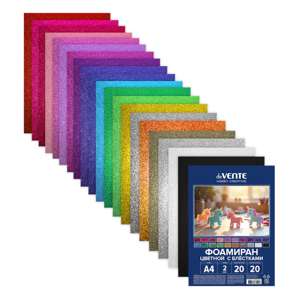 Пористая резина (фоамиран) А4 20л/20цв "Цветной. Блестки" 2мм 8112420 deVENTE