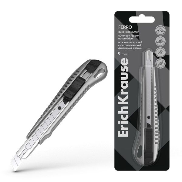 Нож канцелярский 9мм "Ferro" метал.корп., автофиксатор, серебро, блистер EK19157 Erich Krause