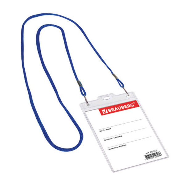 Бейдж 95*145мм вертикал., 2карабина/шнурок синий, пластик, прозрач. 235716 Brauberg (1шт)