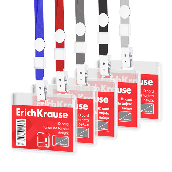 Бейдж 54*86мм горизонт., клип/шнур ассорти, пластик прозрач. 62087 Erich Krause (1шт)
