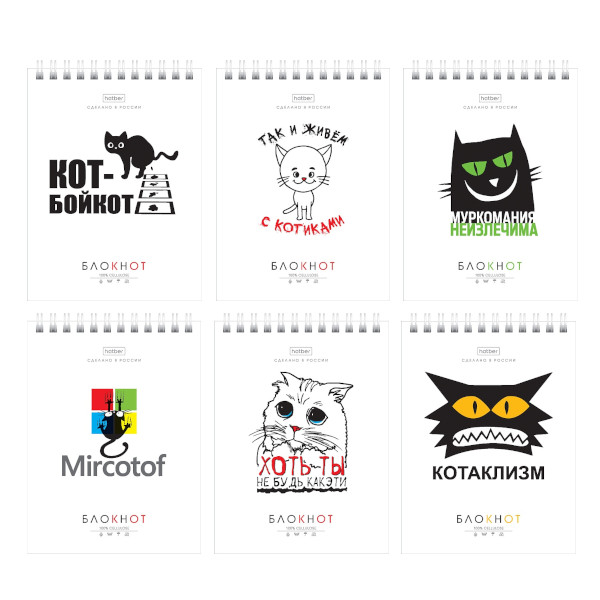 Блокнот А6 40л "Муркомания" клетка, гребень, мягк.обл., картон, ассорти 40Б6В1гр Hatber