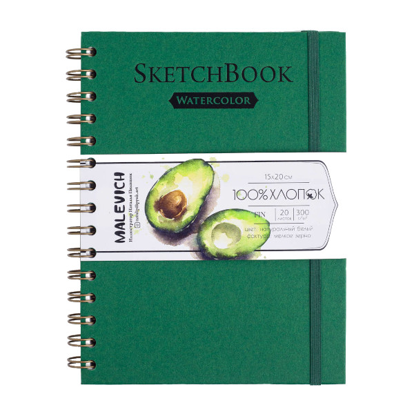 Скетчбук для акварели А5- 20л, 300г/м2, гребень, зеленый, резинка 401512 Малевичъ