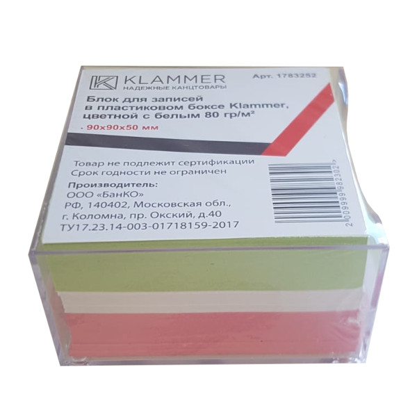 Блок для записей в пласт. боксе Klammer, 90*90*50мм, цветной с белым 80гр 1783252
