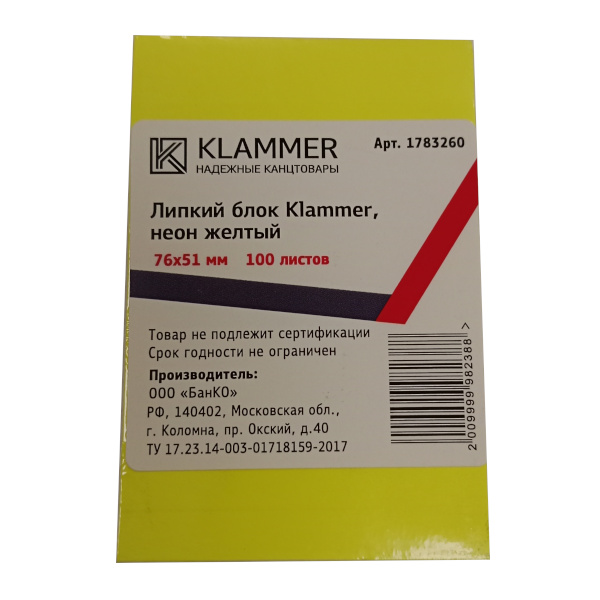 Липкий блок Klammer 76*51мм, 100л, неон желтый 1783260