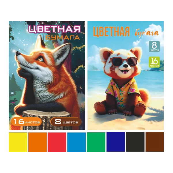 Бумага цветная немелованная А4 16л/8цв, скоба "Лиса/Панда" 00858 Lamark
