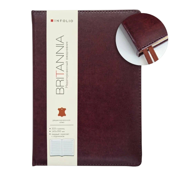 Ежедневник не дат А5 Infolio "Britannia" 160л., тв. обл., рециклированная кожа, бордовый I508/bordo