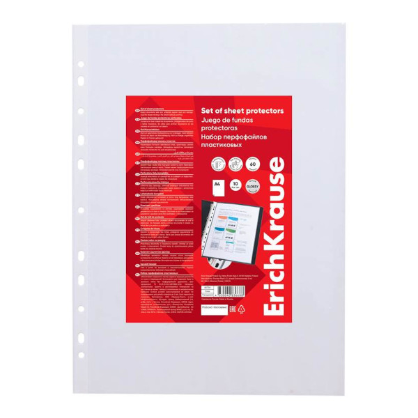 Файл (мультифора) А4 60мкм, прозрачный, матовый "Glossy Clear" 46704 (уп 10шт) Erich Krause упаковка