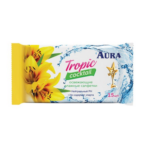 Салфетки влажные Aura "Tropic coctail" освежающие, ассорти, 15*20см, 15шт/пач 83824