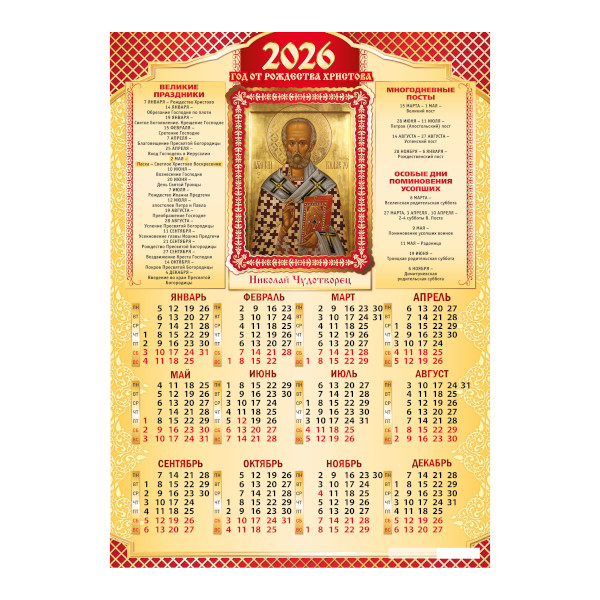 Календарь настен. лист А3 2026г "Николай Чудотворец" 9690 Квадра