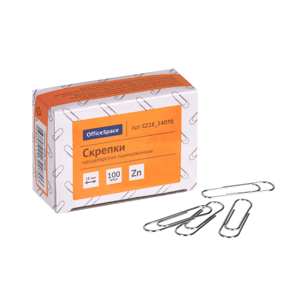 Скрепки 28мм OfficeSpace овальные, оцинкованные, в карт.уп (100шт) CZ28_34070