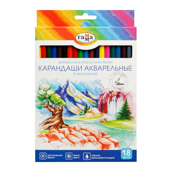 Карандаши акварельные Гамма "Классические" 18цв., 6-гран., дерево, +кисть 221118_03_03