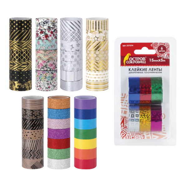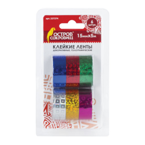 Клейкие ленты для декора "ГОЛОГРАФИЧЕСКИЕ" 15мм*5м, 6цв., полимерная плёнка 227274 ОСТРОВ СОКРОВИЩ