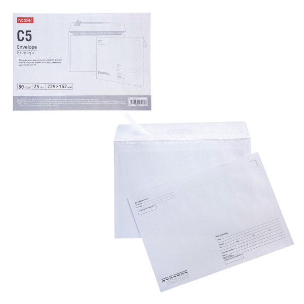 Конверт С5 162*229мм без окна, запечатка, стрип, 80г/м2 (уп*25шт) 5LK_02500 Hatber