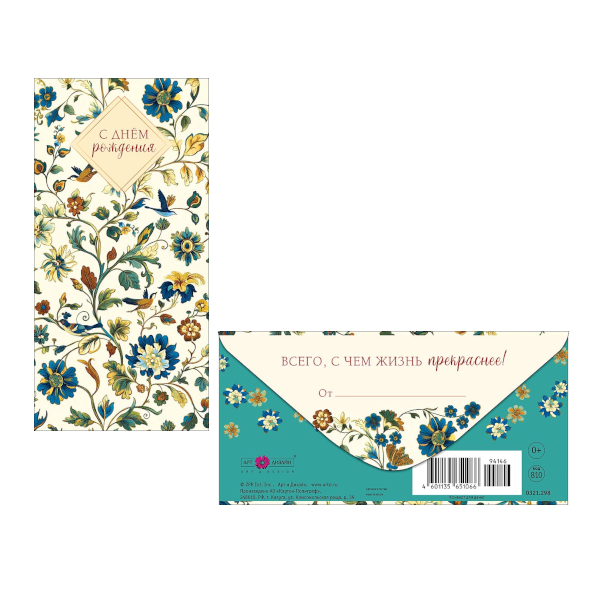 Открытка-конверт для денег "С Днем Рождения. Сказочные цветы" 8,3*16,7см 0321.298 Арт Дизайн