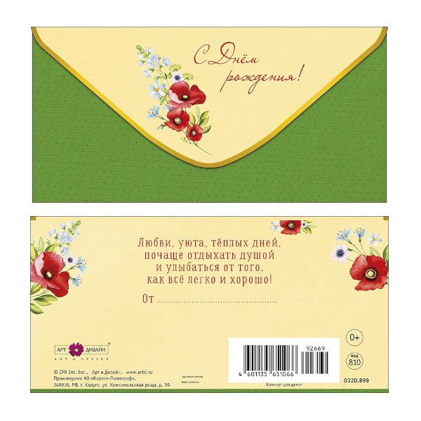 Открытка-конверт для денег "Цветы" 8,3*16,7см 0320.349 Арт Дизайн