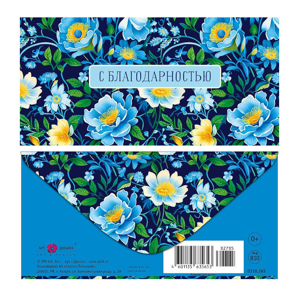 Открытка-конверт для денег "С благодарностью. Цветы на синем" 8,3*16,7см 0318.265 Арт Дизайн