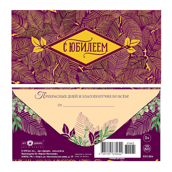 Открытка-конверт для денег "С юбилеем. Листья на фиолетовом" 8,3*16,7см 0317.854 Арт Дизайн
