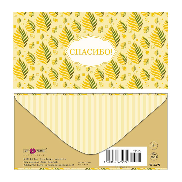 Открытка-конверт для денег "Спасибо! Желтые листочки" 8,3*16,7см 0318.393 Арт Дизайн