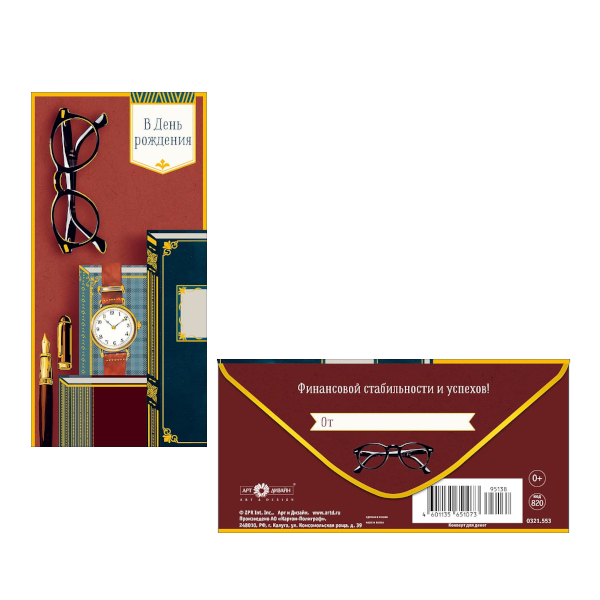 Открытка-конверт для денег "В День Рождения. Очки, книги" 8,3*16,7см 0321.553 Арт Дизайн