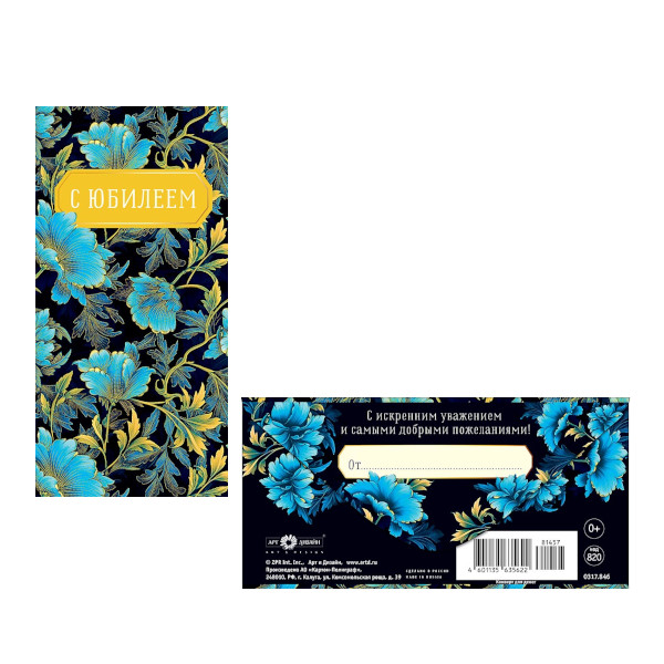 Открытка-конверт для денег "С юбилеем! Голубые цветы" 8,3*16,7см 0317.846 Арт Дизайн