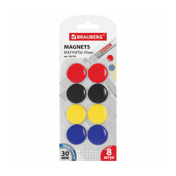 Магнит для белой доски 30мм, 8шт, круглый, ассорти, блистер 230758 Brauberg