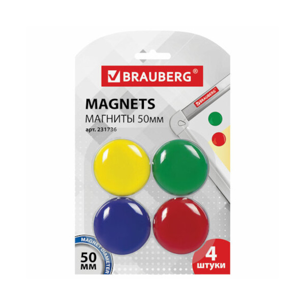 Магнит для белой доски 50мм, 4шт, круглый, ассорти, блистер 231736 Brauberg