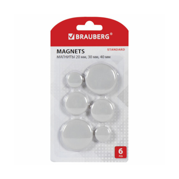 Магнит для белой доски 20мм, 30мм, 40мм в блист. 6шт, круглый, серый 237473 Brauberg