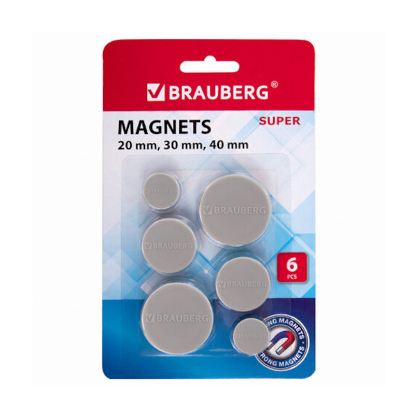 Магнит для белой доски 20мм, 30мм, 40мм в блист. 6шт, круглый, серый МОЩНЫЙ 237481 Brauberg
