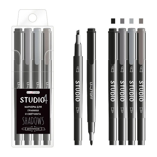 Набор маркеров Listoff "Studio. Shadows" 4цв., двустор., пулевид./скош., ПВХ-уп НМД40043