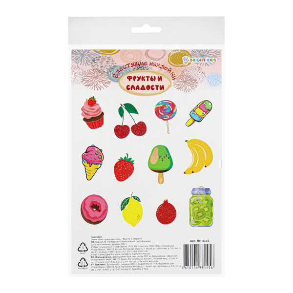 Наклейки декоративные "Блестящие. Фрукты и сладости" А5, 12шт НН-8143 Bright Kids.