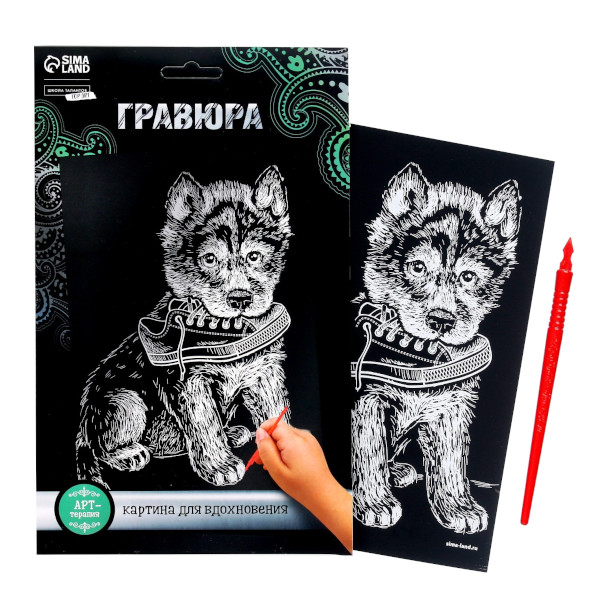 Набор для творчества Школа талантов "Щенок с ботинком" гравюра А5, эфф. серебро 2108201