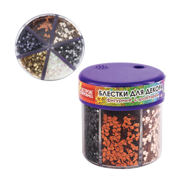 Блестки для декора Остров сокровищ ФИГУРНЫЕ МЕТАЛЛИК в диспенсере с дозатором 6цв по 9гр 191373