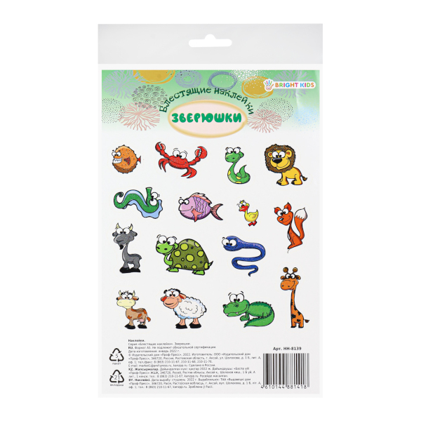 Наклейки декоративные "Блестящие. Зверюшки" А5, 15шт. НН-8139 Bright Kids