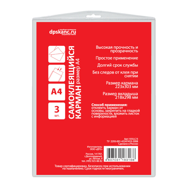 Карман самоклеящийся А4 ДПС вертикальный прозрачный 1555.С/3