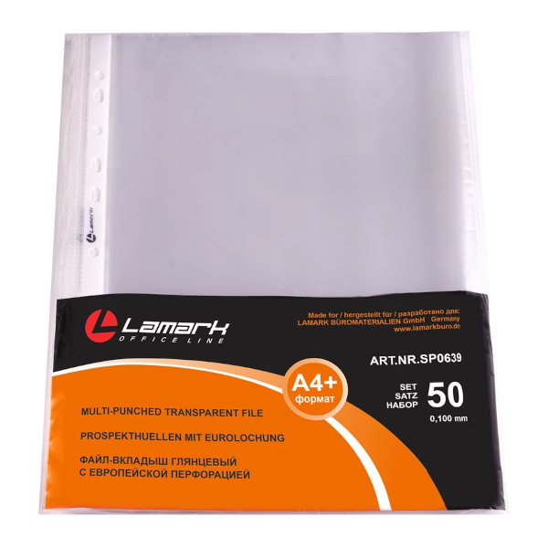 Файл (мультифора) А4+ 100мкм, прозрачный, глянцевый SP0639 (уп 50шт) Lamark упаковка