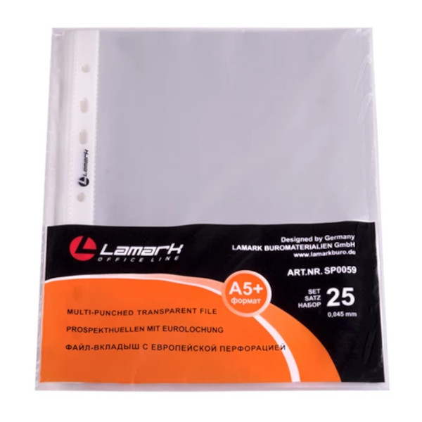 Файл (мультифора) А5+ 45мкм, прозрачный, матовый SP0059 (уп 25шт) Lamark упаковка