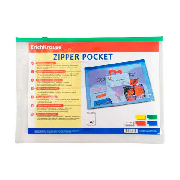 Папка на молнии "ZIP" А4, пластик, 140мкм, прозрач. ассорти 2935 Erich Krause