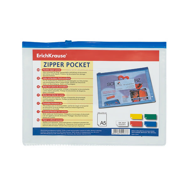 Папка на молнии "ZIP" А5, пластик, 140мкм, прозрач. ассорти 2937 Erich Krause