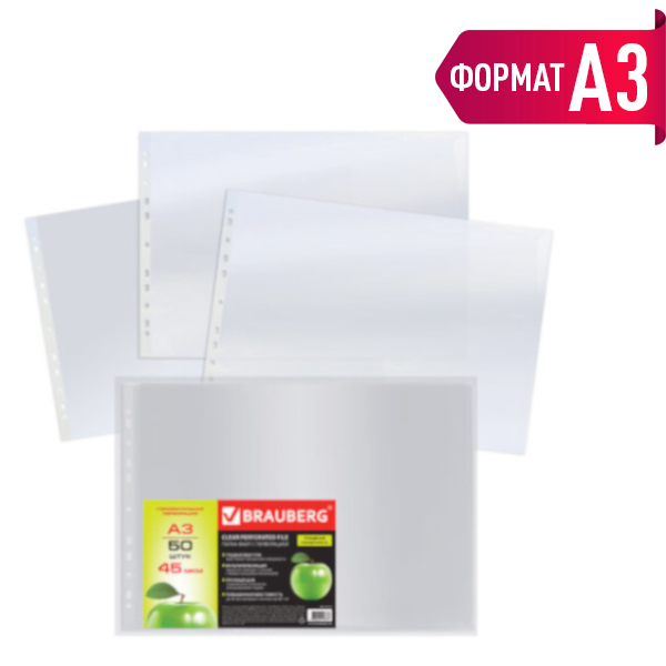 Файл (мультифора) А3 45мкм, горизонт., прозрачный, глянцевый "Яблоко" 221715 (уп 50шт) Brauberg упак