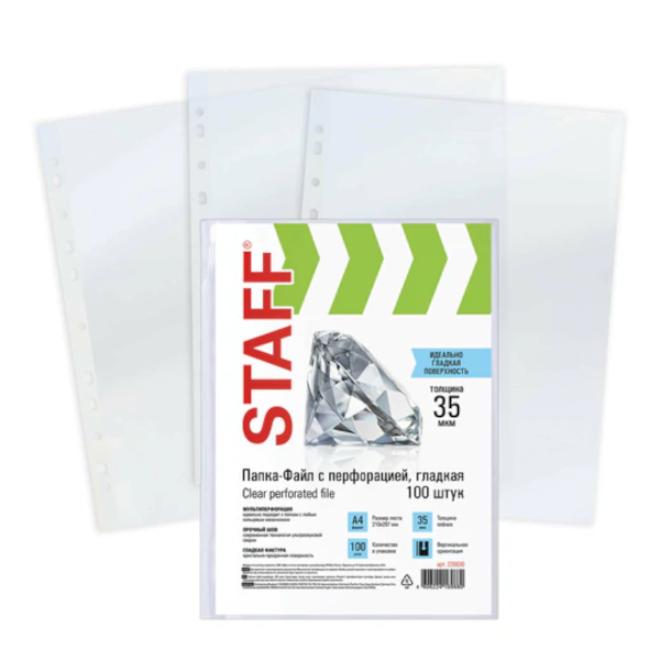 Файл (мультифора) А4 35мкм, прозрачный, глянцевый (уп 100шт) 226830 Staff упак
