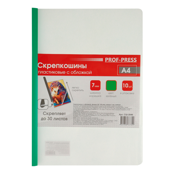 Папка-скрепкошина А4, 7мм, 180мкм, зеленая на 30л, СШ-2846 Проф Пресс