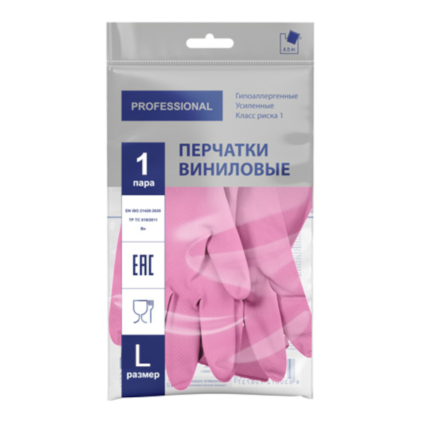 Перчатки хозяйственные виниловые ADM "Professional" розовый, р.L V7603PI (1пара)