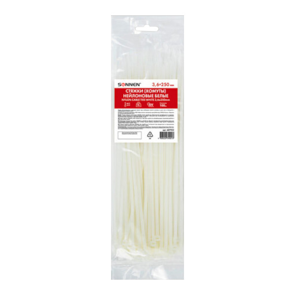 Хомуты (стяжки), нейлоновые, 3,6*250 мм, белые, (1уп*100шт) 607922 Sonnen упаковка