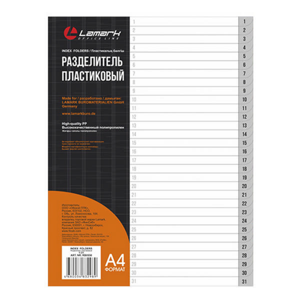 Разделитель А4 цифровой (1-31), индексы, серый, пластик 550 Lamark