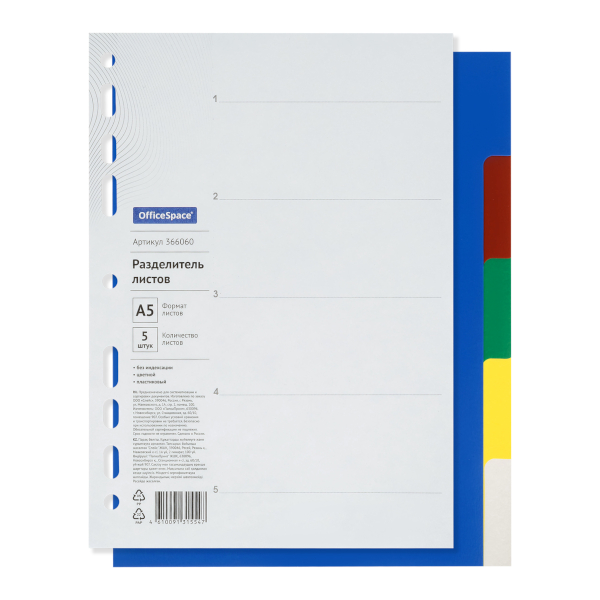 Разделитель А5 цветовой (5цв), без индексации, пластик 366060 OfficeSpace