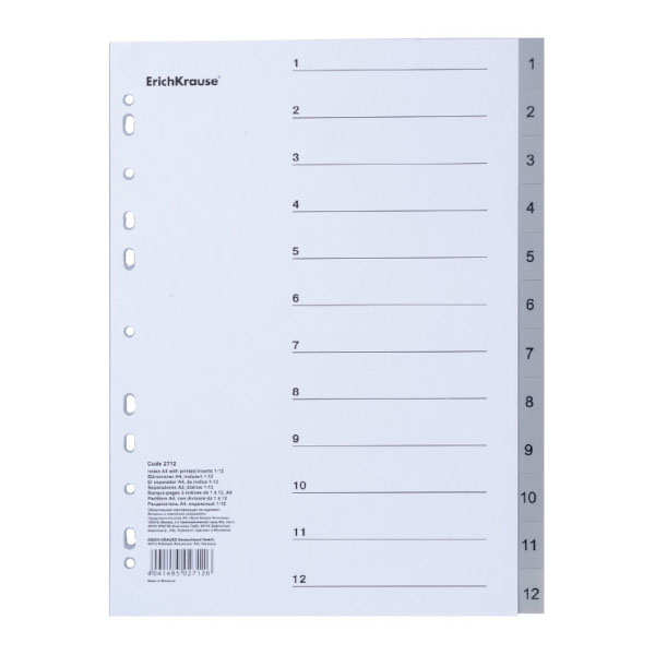 Разделитель А4 цифровой (1-12), индексы, серый, пластик 55899 Erich Krause