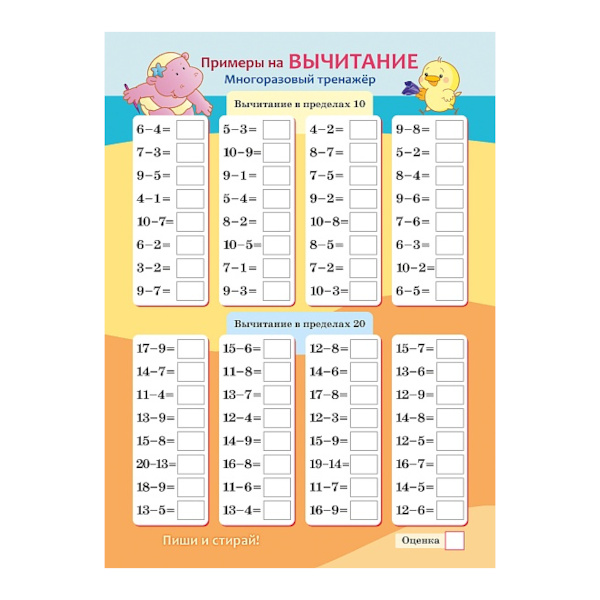 Обучающие карточки "Многоразовый тренажер. Сложение и вычитание" 1 карт., А4 Ио4_30485 Hatber
